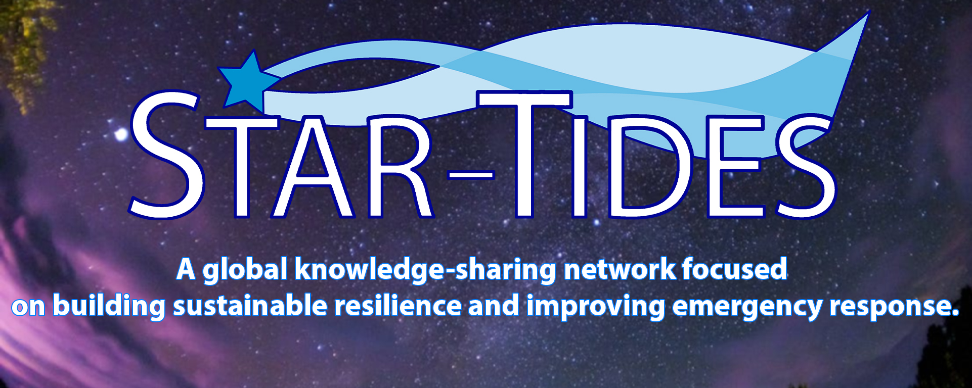 STAR-TIDES (Sharing To Accelerate Research – Transformative Innovation for Development and Emergency Support) is a global network of several thousand people and organizations from government, the private sector, academia, NGOs and others. Members share knowledge to help build sustainable resilience and improve emergency responses. STAR-TIDES is coordinated with the Center for Resilient and Sustainable Communities (C-RASC) at George Mason University.